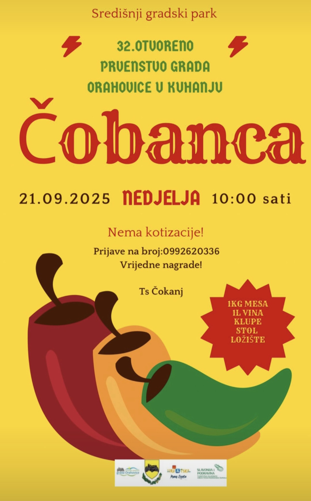 U organizaciji Grada Orahovice i Turističke zajednice grada Orahovice, a pod pokroviteljstvom Pro ping TELEKOM-a, u nedjelju, 21. rujna 2025. godine, s početkom u 10:00 sati, u središnjem gradskom parku održat će se 32. Otvoreno prvenstvo grada Orahovice u kuhanju čobanca.
