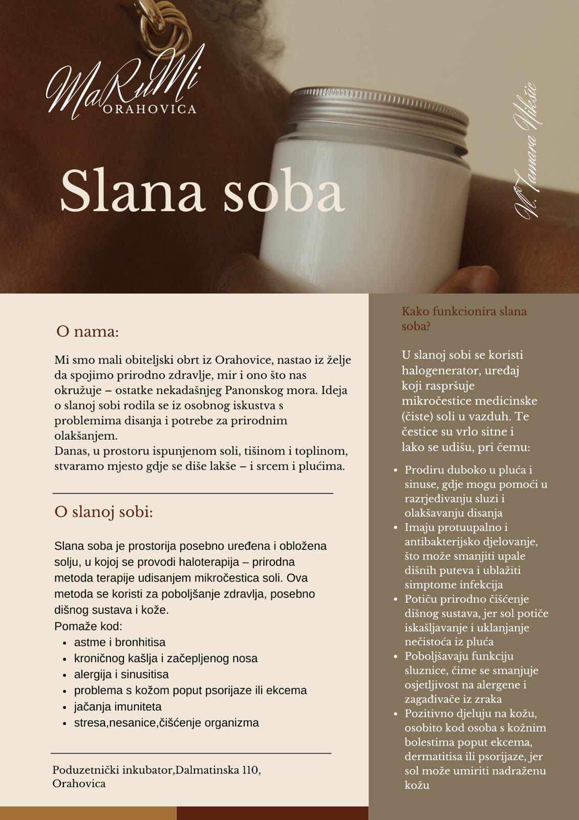 Slana soba je prostorija obložena prirodnom solju, u kojoj se uz pomoć uređaja (halogeneratora) u zrak raspršuju sitne čestice soli. Ova mikroklima djeluje blagotvorno na dišni sustav i kožu. Boravak u slanoj sobi najčešće traje 20 do 40 minuta, a koristi se za opuštanje i kao podrška kod respiratornih tegoba poput astme, alergija, bronhitisa i prehlada. Terapija je prirodna, bezbolna i pogodna za djecu i odrasle.